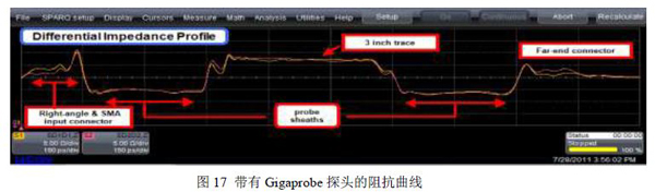 使用Gigaprobe对3inch的PCB走线进行测量得到的阻抗曲线图,从图中我们可以大致分辨出哪部分是探头的阻抗曲线,那部分是3inch走线的阻抗曲线。