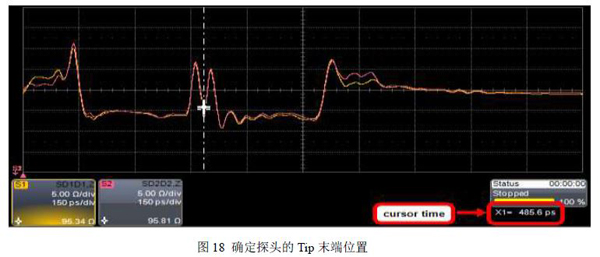 将两个Gigaprobe探头的Tip和Tip连接到一起(实际应用中,建议使用一段100mil的PCB走线以使连接更可靠),如下图18所示,白色垂直虚线为两个探头的中心位置(探头的Tip的最末端),根据这个中心位置,我们可以预测出探头的延时。然后我们可以通过S21来得到探头的损耗,将延时参数和损耗参数输入到去嵌界面中即可实现对Gigaprobe探头的去嵌。