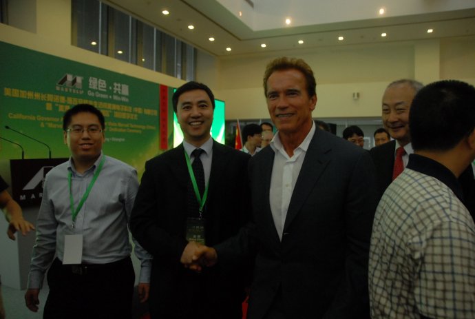 文后记:在半导体产业逐渐向中国转移的时候,其实美国政府对本土半导体企业的支持一直没有减少。周日Marvell在上海举办“Marvell(中国)绿色园区”签约仪式,大名鼎鼎的州长施瓦辛格便亲自来上海出席,显示了美国地方政府对Marvell,对半导体产业的支持与关心。下图是我和施瓦辛格的合影(最左边的是俺:))(单独合影的照片还没拿到)