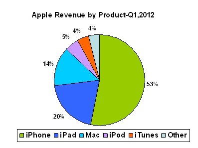 而在移动互联时代大热的全球第一高科技公司---苹果,更是被N多人捧为软件应用和服务的典范,但在其2012年财年第一季度的产品比重中,可以看到软件的收入(iTunes)仅占4%。硬件收入占了其96%的销售额。而它的硬件又支撑其众多的App应用软件开发公司。