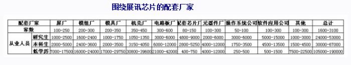 仅仅围绕着展讯的基带核心芯片,相关的配套厂家便有大概1600-3100家:屏厂,模组厂,模具厂,机壳厂,电路板厂,配套芯片厂,元器件厂,操作系统公司,软件应用公司等等。而在这些厂家里面,从业人员从小学学 历到博士生,应有尽有。根据不完全统计,这些配套厂家雇佣了研究生学历的从业人员大概24000-53000;本科学历的在30000到67000;低学历的在10万到20万。(见下图)