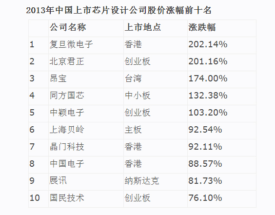 事件:12月31号一年股市正式收市,在资本市场中国的集成电路设计产业上下一片红。受到多重利好的影响,芯片设计公司在去年的股市市场绝对是“梦里喜悦无说处”。25家芯片设计公司的股票仅有两家下跌。综合涨幅超过100%。而在涨幅前十名的公司中,第十名的涨幅就高达76.1%。与此同时前十名的公司中:主板、中小板、创业板、香港主板、香港创业板、台湾股市和纳斯达克都有,这表明全球资本市场都对中国芯片设计业的信心与期待。