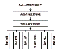 从图中可以看出,本系统可以分为3 个部分,首先是底层的智能家居安防网络,这是整个系统的硬件部分,可以监测温度、光强、煤气、人体红外、门窗、灯光控制等。在硬件部分的基础上市安防信息监控管理和Android 智能终端监控,这是整个系统的软件部分,主要是对从底层收集到的信息做出处理并给出控制信号。本文主要研究底层的硬件设计。