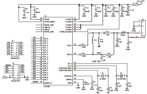 美国德州仪器TI 生产的CC2530 是一种SoC 芯片,基于IEEE 802.15.4 标准和ZigBee 协议规范。图3 所示是CC2530的射频模块电路,同时,TI 公司还专门为使用CC2530 芯片的用户提供了整套的开发工具和Z-stack 协议栈,通过这个专用工具,用户可以节约大量的开发时间并且可以按照自己的想法开发自己的产品。CC2530 芯片本身就是一个非常成熟的芯片,同时功能也非常强大,用户只需要给其接入产品需要的外围器件就可以满足用户的开发要求。本文为了使CC2530 模块能够与传感器相连接,采用排针将CC2530 的I/O口引出来,如图3 中的P1 和P2。