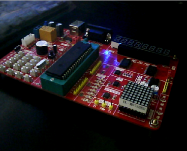 过了几天散件到货了,收到货一口气的焊完其它的元器件,满分自信觉得自己的焊工没问题;但是下载程序时就是连不上也检测不到单片机,怀疑单片机是坏的?还是USB下载线有问题?最后究过一番折腾还是不行,没办法就请教了版主,散件里有个电容值给带小了,470UF错待了220UF导致电容量小,下载的供电电压不够,达不到稳定的电压与电流导致CH340电压偏低检测不到电脑USB发出的传输协议,从而也导致了检测不到单片机造成无法下载结果;这也让我学到了这点知识很重要,索性将板子上的2个供电稳压电容都换成了470UF,下载OK;可是新的问题又出现了,板子让写了个简单的测试板子代码,比如LED,数码管,按键等;但是LED正常;到了数码管就出问题了;先开始怀疑代码有问题,结果反复修改不见效果,最后终于有点动静了;这是位选没问题,据判定问题出在段选的573芯片上,芯片内部有线路损坏问题;这板子真是一拨几折,好郁闷,向版主说了情况版主答应给解决此问题了,原来是LED点阵影响了数码管的正常显示,这问题还有待解决,还有就是光盘都忘记带上了,我真是发狂!但是在版主的空间里看到用单片机的做的简易电视真是既好奇又兴奋给了我充分学习的动力,发誓一定要更着视屏测底学懂单片机,哈哈哈;这也为以后的做的东西做准备;亮几张不起眼的照片吧,还请大伙别用板砖砸我哦