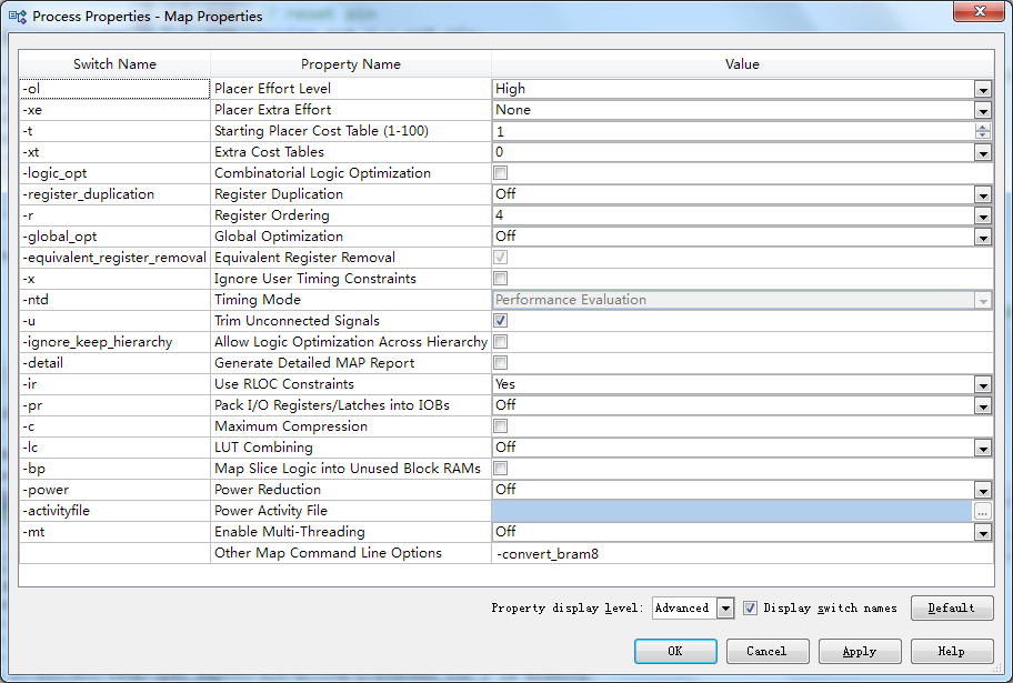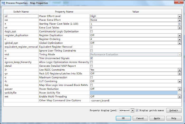 按照提示,问题出在这个9Kb的block RAM。问题偏偏只出现在Spartan 6的FPGA上,因为上述的msp430的程序使用RAMB8BWER实现,而初始化的数据无法正常使用,通过查看Xilinx Answer Record ,得到解决办法是,在Map的时候,对于map器传入参数-convert_bram8即可,强制按8bit进行初始化,至于为什么这么做,我也不清楚,也许涉及到S6 的实现方式吧。设置如下: