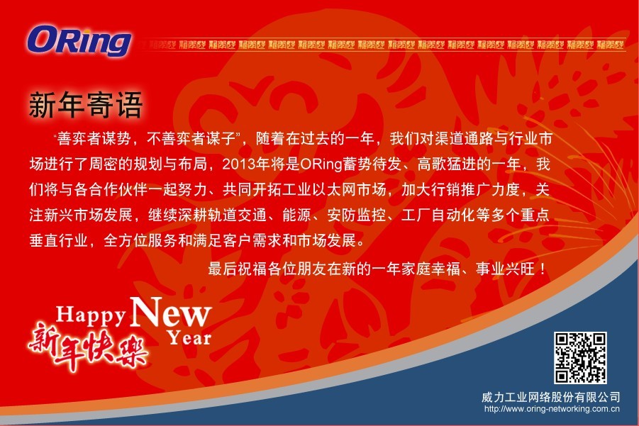 “善弈者谋势,不善弈者谋子”,随着在过去的一年,我们对渠道通路与行业市场进行了周密的规划与布局,2013年将是ORing蓄势待发、高歌猛进的一年,我们将与各合作伙伴一起努力、共同开拓工业以太网市场,加大行销推广力度,关注新兴市场发展,继续深耕轨道交通、能源、安防监控、工厂自动化等多个重点垂直行业,全方位服务和满足客户需求和市场发展。