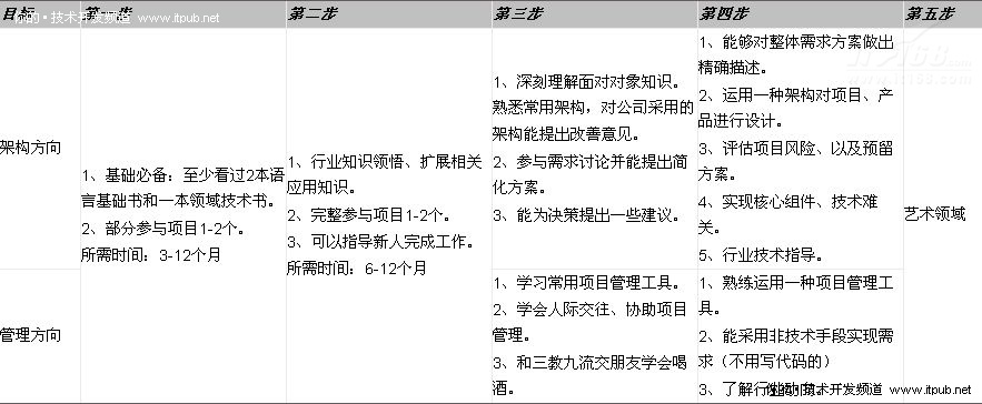 我给出了3类程序员可能发展的方向。其中最强调的就是在工作中得到提升。在工作中提成,一般对程序员说来有2个目标。一个是做架构设计-将来可以做产品的规划,或者项目规划和指导。另一个往管理发展,将来可能涉及的不知是单纯的技术。以下的步骤只是一些常规的做法。