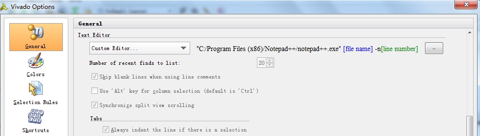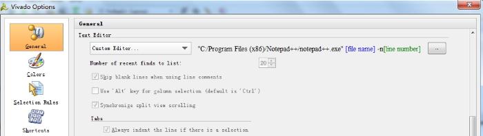 2.vivado中依次选择“Tools——Options..."进入”vivado options“对话框,在”General“栏中的”Text Editor“选项卡中选择”custom Editor“,并输入notepad++的路径,如下图: