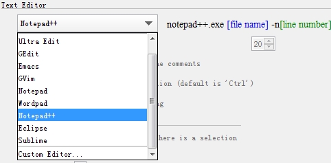 注:虽然有提供直接选择的notepad++(下图),但是选择后设置不了路径,所以选择了”custom editor“,然后手动输入路径。