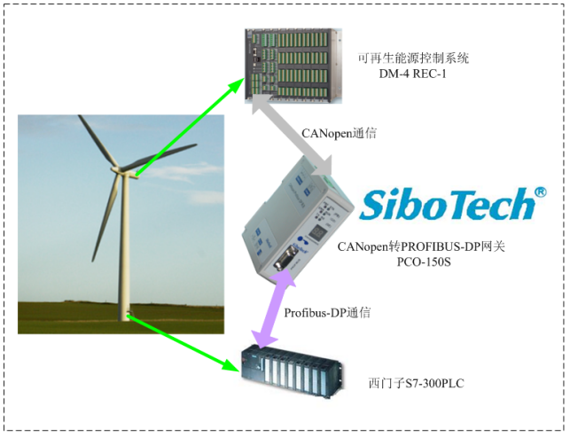 风力发电机组有风轮、传动系统、偏航系统、液压系统、制动系统、发电机、控制与安全系统(主控系统)、机舱、塔架和塔基等组成。SiboTech的CANopen转PROFIBUS-DP网关的作用主要是实现塔基主控系统与机舱可再生能源控制系统的通讯。其中,塔基主控系统包含主速度控制器和变流、逆变器,主速度控制器采用的是西门子S7-300系列可编程逻辑控制器(PLC);可再生能源控制系统采用丹麦DEIF的DM-4 REC-1,是机舱控制柜的主要部分,还包含交、直流伺服驱动控制器等。