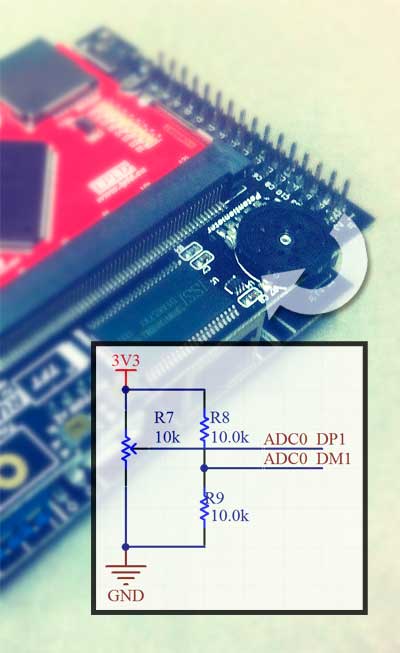 如果你使用RUSH Kinetis开发板,那么可以直接将本例程下载到芯片中,通过旋转母板上的可变电阻器观察结果输出。无论你怎么旋转旋钮,输出结果总是0~4095之间。这说明单端输入的电压量总是、也只能是正电压,旋钮的位置以及相应的原理图如下图所示: