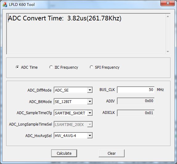 不知道大家有没有被上面的公式弄糊涂,如果没明白也没关系,因为下面有更方便的方法来知道AD转换时间到底是多少。不过首先你要下载一个“OSKinetis小工具”,打开后选择“ADC Time”选项,根据例程LPLD_AnalogSampleSE中的ADC初始化配置设置相关选项,点击“Calculate”后便会在界面中显示出当前ADC模块的转换时间以及频率,如下图所示: