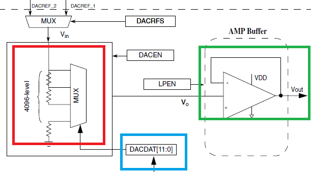 上图是截取的模块框图的上半部分,其中红框内就是实现电压转换的部分,大家可以理解为K60内部通过4096个等值的电阻将参考电压分成了4096分,而MUX则根据蓝框中的值来判断到底选择哪个分压值进行输出。这个蓝框中的值就是大家在编程中设置的输出值,它其实是一个缓冲区,可以配置为不同的模式来输出缓冲区中的值。绿框中的部分是一个缓冲放大器,途中的DACEN是一个寄存器控制位,用来使能DAC工作,DACRFS用来选择参考电压,LPEN用来使能低功耗模式。