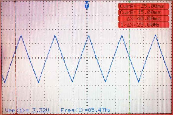 打开例程“08-(DAC)LPLD_AnalogSignalOutput”(请使用该例程的0.2版本,0.1版本存在BUG),编译下载后运行,用示波器观察DAC0_OUT引脚的波形,会看到三角波的产生,如下图所示: