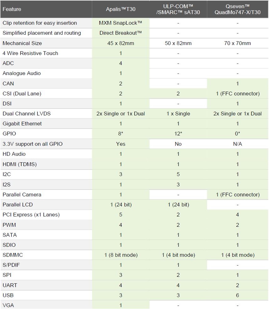 3, Apalis , 是有瑞士的Toradex公司主导成立,听说只有德国的几家小公司在跟进。它的优点在于对CPU利用率很高,达95%。但缺点是,无法与X86做任何兼容,因为Apalis只针对ARM架构的定义。还有一个缺点是,此Form Factor 目前支持的厂家还不多。