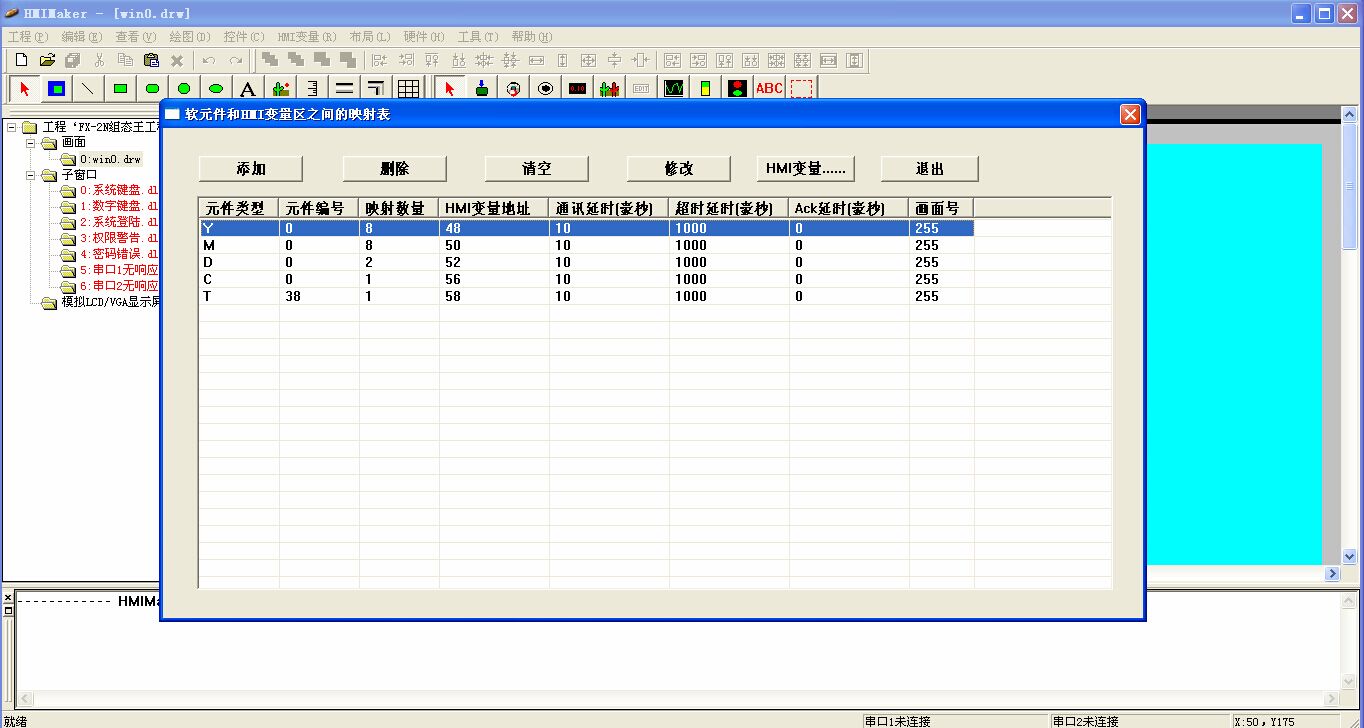 比如元件类型Y,元件编号0,映射数量8(1个字节),对应的HMI变量起始地址48。意义就是把Y0到Y7映射到HMI变量地址48(char类型,1个字节)。