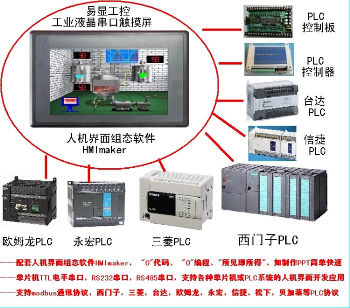 此范例将介绍如何快捷简易地建立易显工业串口触摸屏与PLC工控板的人机界面应用开发示例。采用的是人机界面组态软件HMImaker开发界面。 "0"代码、 "0"编程、"所见即所得"、如制作PPT简单快速。 支持三菱PLC,西门子PLC,,台达,欧姆龙,松下,信捷,永宏等PLC通讯使用,支持modbus通讯协议。