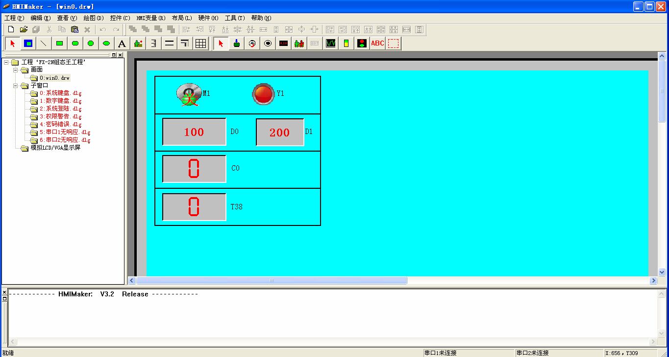 三、在画面0建立控件,位开关M1,指示灯Y1,实施数值D0,D1,C0,T38.