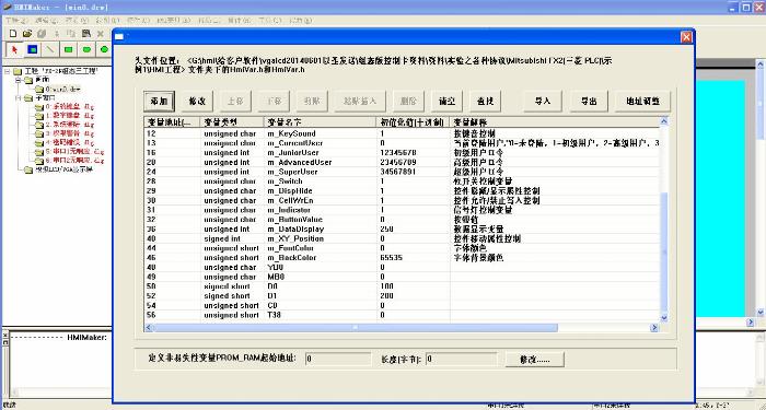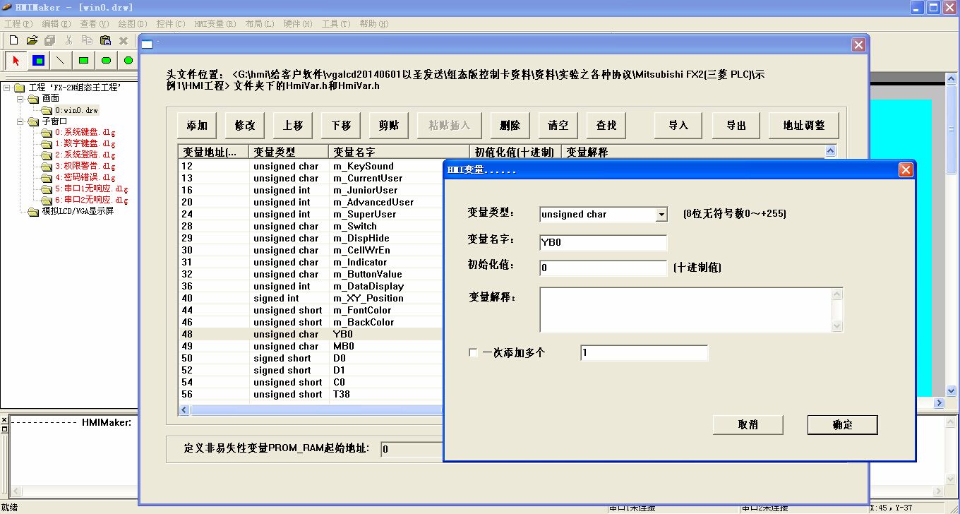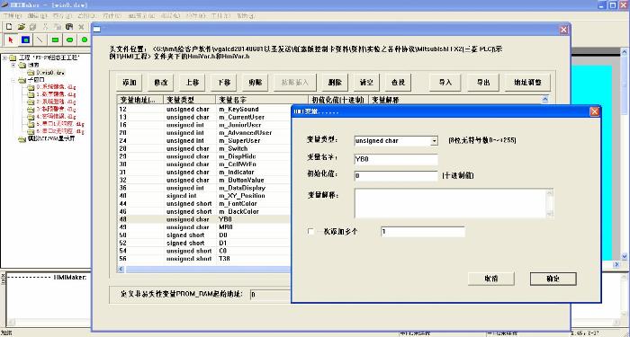 四、在菜单【HMI变量】建立控件的变量地址位指示灯YB1,开关MB0,实时数值D0,D1,C0,T38。地址分别是48,49,50,52,54,56.初始化值设置多少没有关系。