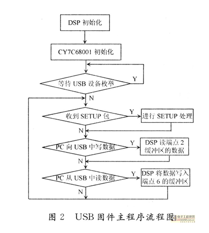 CY7C68001是用来连接微处理器或DSP的DMA从装置,其内部不含微处理器;集成有USB2.0收发器(物理层)、USB2.0串行接口引擎SIE(链路层、实现底层通信协议)、4kB的FIFO和电压调节器、锁相环;支持高速(480Mb/s)或全速(12Mb/s)传输;3.3V操作电压,24MHz外部振荡频率;可以选择8位或16位总线方式;具有同步与异步的FIFO接口;他可以向用户提供足够的端口,缓冲区和传输速度,提供USB2.0协议要求的全部4种传输方式(控制传输、中断传输、批量传输和同步传输),可以满足用户对各种类型数据传输的需求。片上的串行接口处理器(SIE)能完成大部分的USB协议操作,使用户可以摆脱复杂的协议细节,简化了用户配置代码,加快了程序开发过程。但是由于采用的是不带MCU内核的USB接口芯片,USB的应用层协议应该由TMS320VC5416编程实现,USB固件的加载必须靠DSP控制CY7C68001完成。